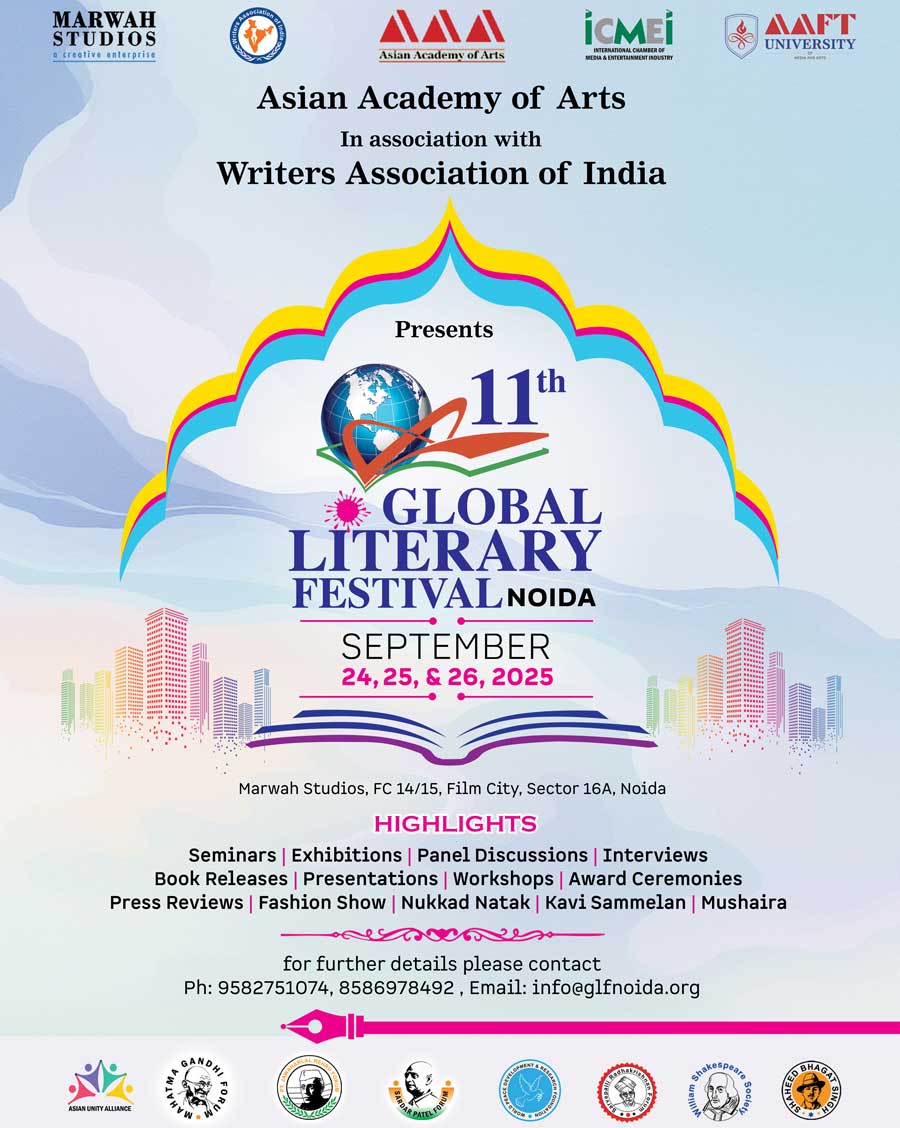 Global Literary Festival Noida is a not-for-profit annual literary festival organized by Asian Academy of Arts in association with International Chamber of Media & Entertainment Industry (ICMEI). GLFN brings together brilliant and unique minds from various genres of the creative world — thinkers, readers, writers, poets, and artists. With an objective to provide enriching insights to the receptive youth of today, this festival brings forward the credible, creative work of both the present genre’s artists and the honorable literary artists of the forgotten era.
